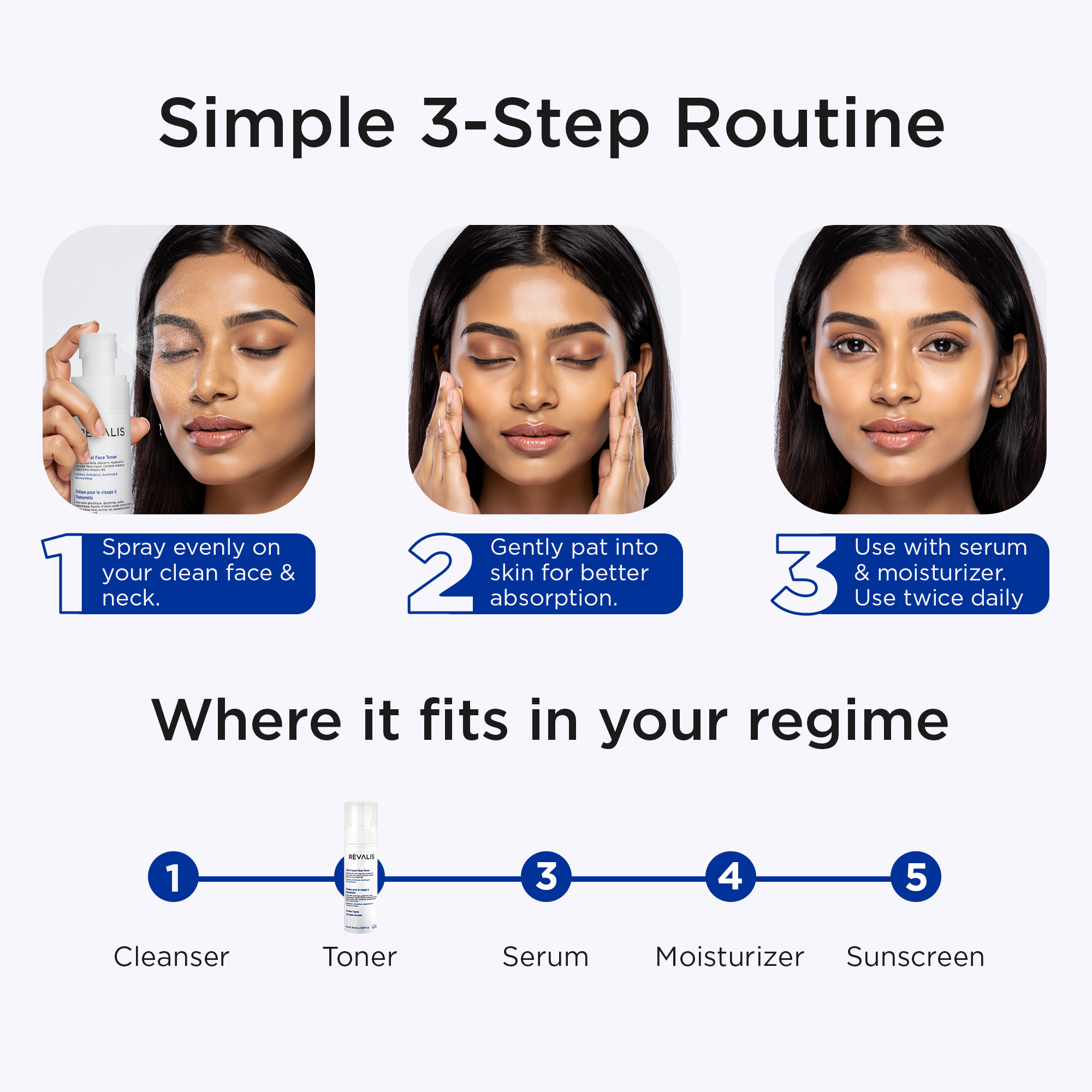 After cleansing your face, spray the toner directly onto your skin or onto a cotton pad. Gently dab it over your face and neck, allowing it to air dry naturally. Follow with your preferred serum and moisturizer for best results.